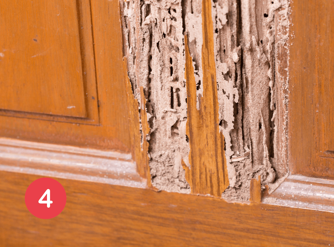• Damaged or Hollow Wood: When termites consume wood, they leave hollow spaces. Tapping on infested wood often produces a hollow sound.